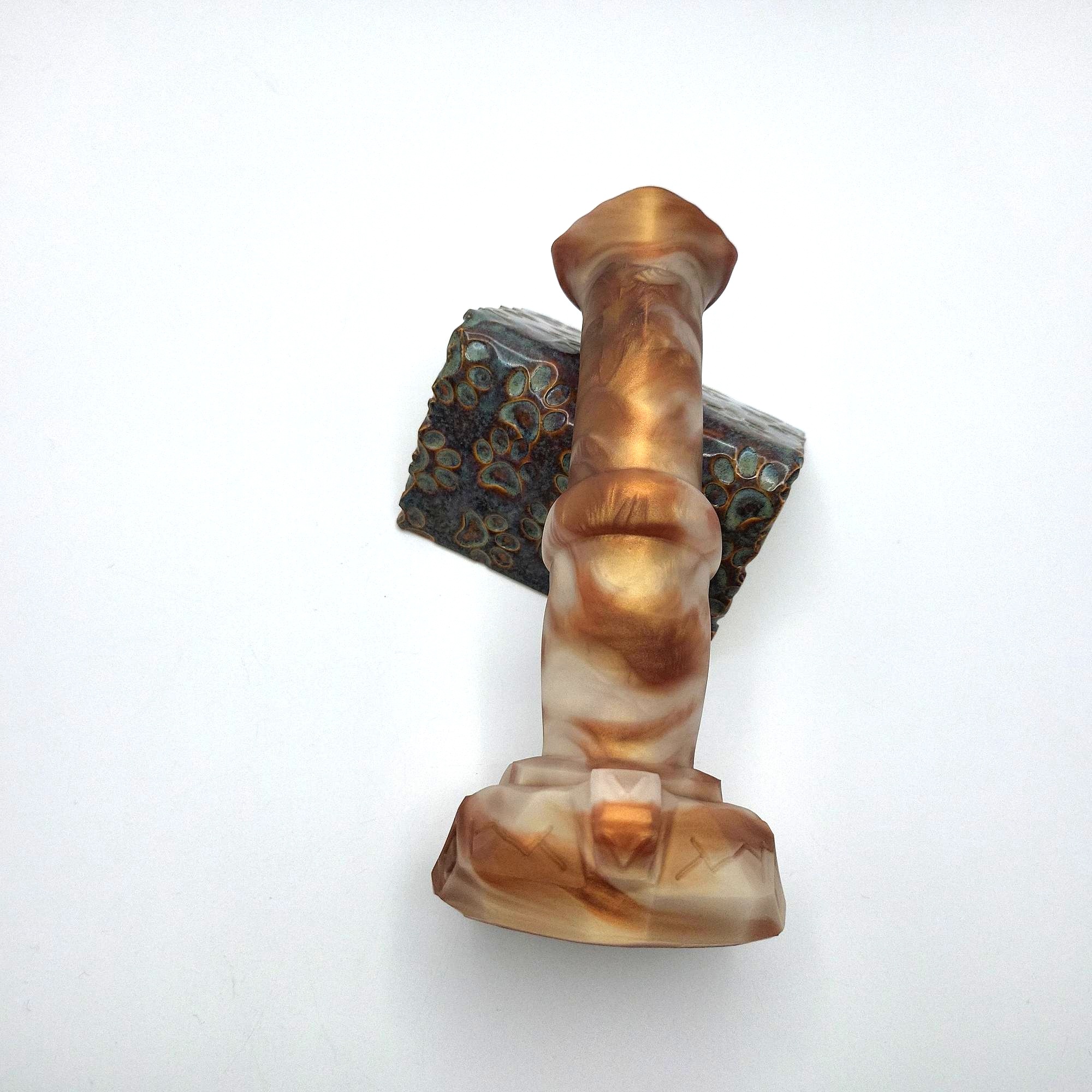 Stoic is quite voluminous, showing its hefty mass and fat flare on the first glance. The angled flare design helps with insertion, providing a smoother experience compared to more common flat flares. Its robust shaft ensures stability during use, minimizing any unwanted wobbling. Handling large toys is difficult enough with all that lube around anyway. The tip works great for both P and G-Spot stimulation. And the pronounced medial ring almost serves as a second flare, it is very noticeable.